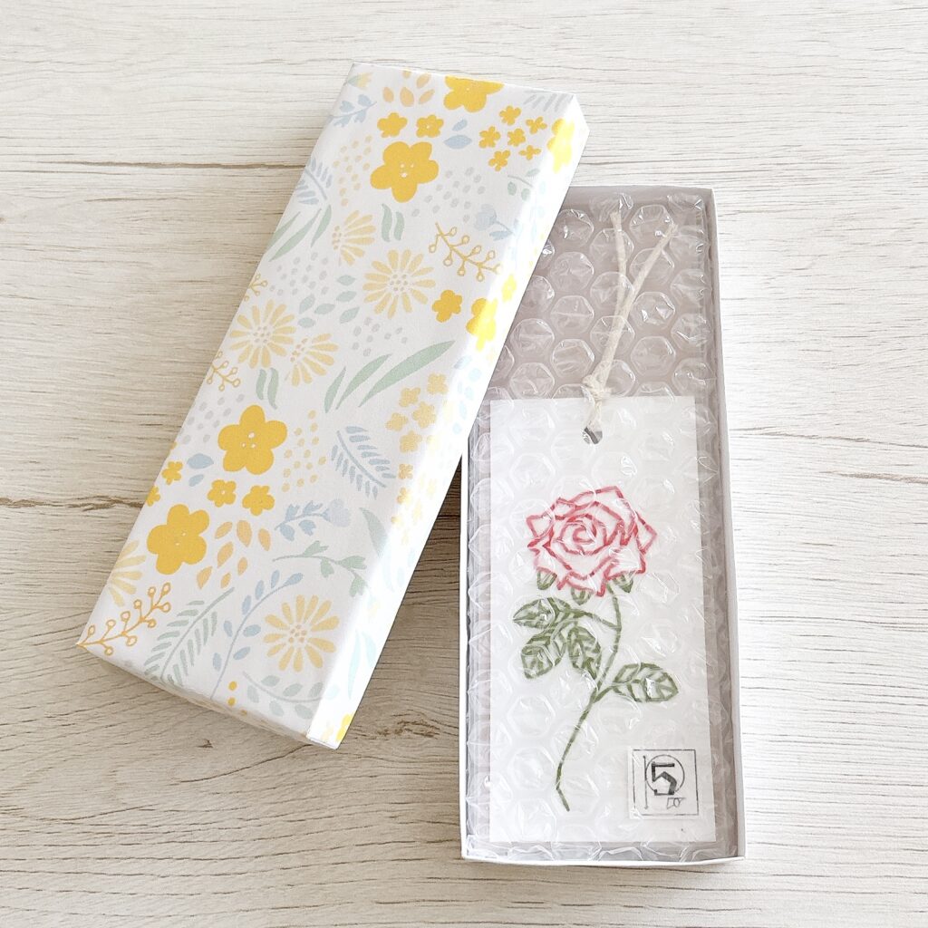 「紙刺繍のしおり 1輪の赤いバラ」を、ギフトボックス(黄色)に入れてみました。